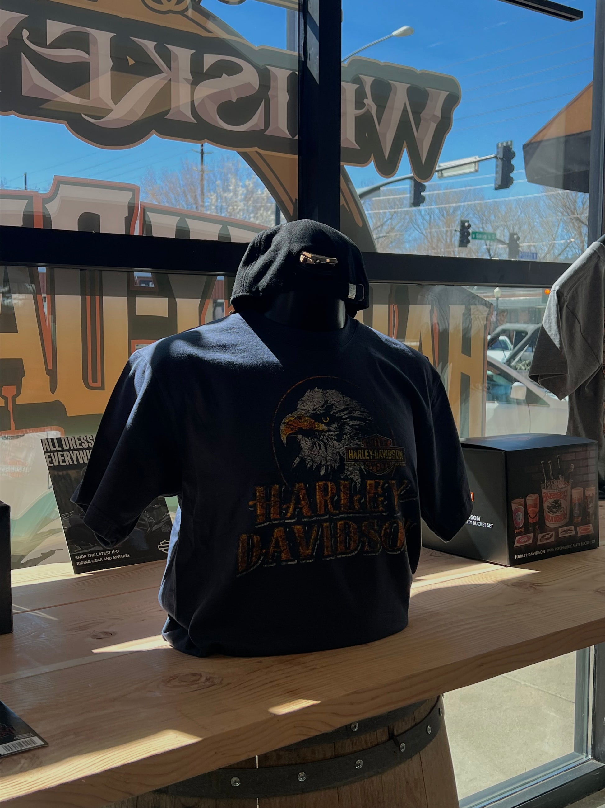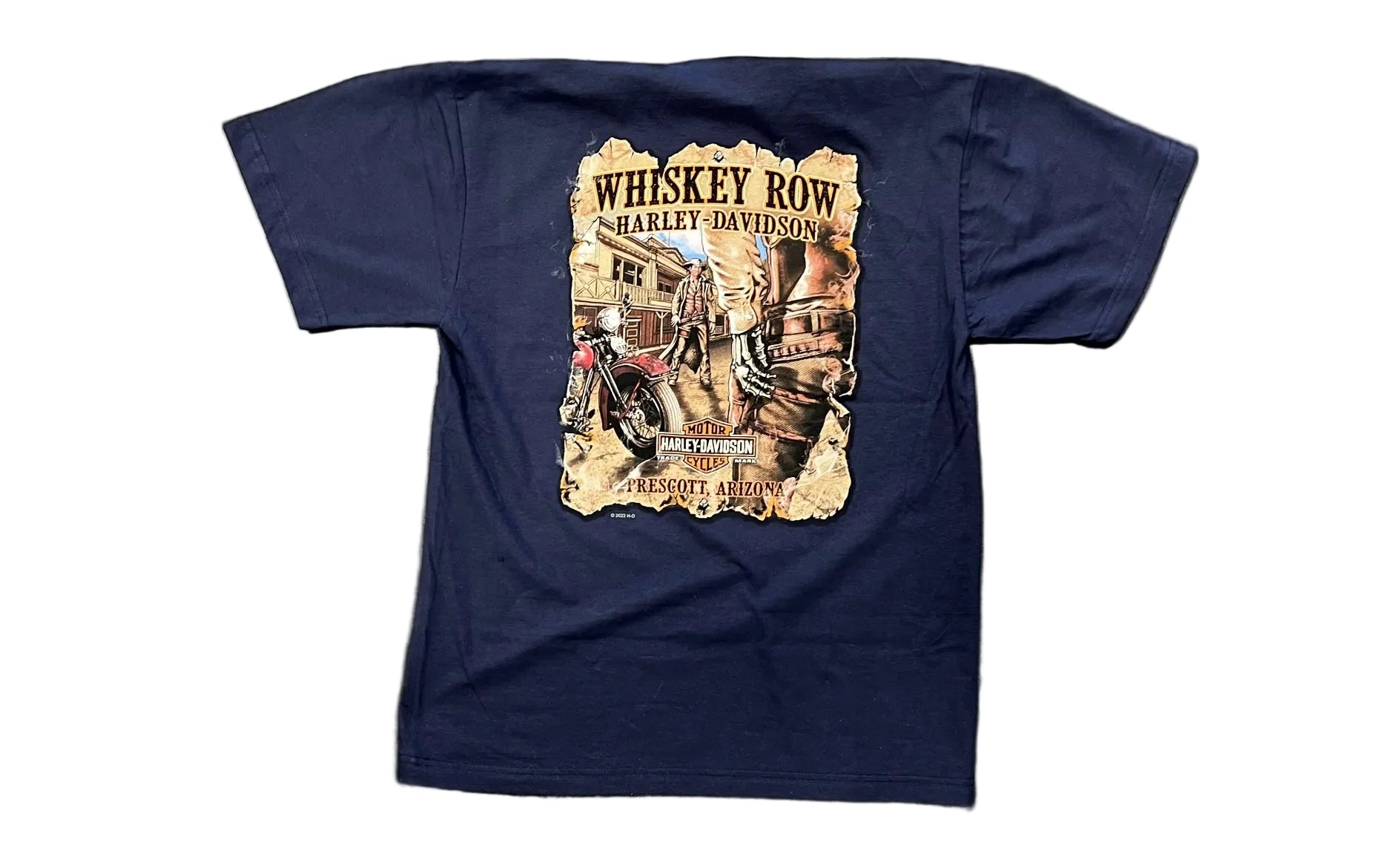 Freedom in a tee. This navy Harley- Davidson dealer shirt features a bold eagle graphic and vintage-style Harley lettering. A standout piece from Whiskey Row Harley-Davidson